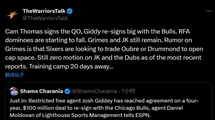 勇士自媒体账号@TheWarriorsTalk 转发了该消息并评论称:“卡梅隆-托马斯接受资质报价,吉迪则拿下公牛大合同。受限自由球员市场开始连锁反应。格莱姆斯与库明加目前仍未确定下家。有消息称76人考虑交易德拉蒙德或乌布雷,以便为格莱姆斯的续约创造空间。而据最新报道,勇士与库明加之间尚未有实质性进展。距离新赛季训练营开幕仅剩二十余天……”