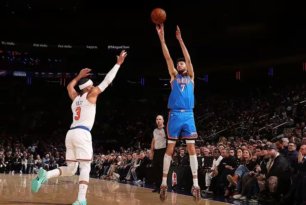 雷霆双子星本场表现很出彩,霍姆格伦制霸内线,砍下28分8篮板的数据,尤其是高炮台的属性,飙中6记3分,让尼克斯防不胜防,也是赢球的关键!